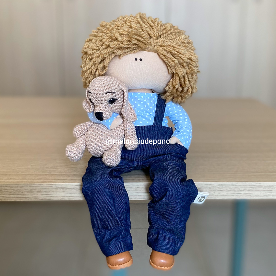 Boneco Decorativo – Macacão Jeans com Camisa Azul Bebê Poá
